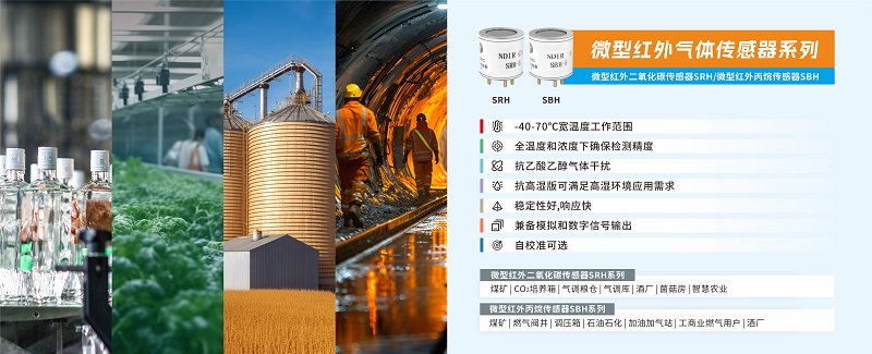四方光電微型紅外二氧化碳傳感器SRH系列和微型紅外丙烷傳感器SBH系列均采用NDIR技術,與熱催化和半導體技術相比不易受有害氣體影響,具有選擇性強、精度高、壽命長的優勢。可以在全溫度和濃度下確保檢測精度,響應快,穩定性好,能夠在曲房和發酵池復雜環境中應用,滿足白酒釀造過程中對于CO2濃度和乙醇揮發濃度監測的需求。