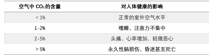 空氣中二氧化碳的正常含量是0.04%,1%是對人體產生影響的臨界值。當二氧化碳的濃度高于1%時,人們會感到嗜睡,注意力不集中;高于2%時會頭痛惡心;高于5%時會昏迷甚至死亡。