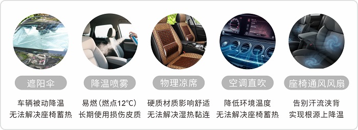 夏季常見的汽車遮陽傘、降溫噴霧、物理涼席等傳統方式無法實現對座椅的直接快速降溫。即便是將車內空調風力調到最大,人體環境溫度雖能下降,但與座椅深層接觸的背部和臀部因空氣不流通會悶熱難忍,尤其是開車久坐時易感到明顯不適。