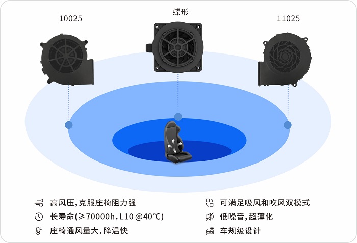 座椅通風風扇分為吸風和吹風兩種類型。吹風模式通過正壓送風實現強制對流,可以快速降低表面溫度;吸風模式則基于負壓原理形成被動散熱,更符合人體熱舒適曲線。而高轉速風扇帶來的噪音會直接影響車內的NVH(噪音、振動和粗糙度)表現,因此座椅通風風扇在均衡轉速、風量、風壓等性能參數時,需兼顧低噪音水平,以提供最佳的使用體驗。