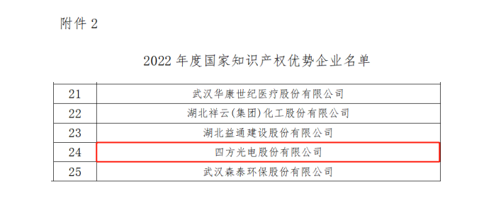 近日,國家知識產(chǎn)權(quán)局公布了2022年度國家知識產(chǎn)權(quán)優(yōu)勢企業(yè)的名單,四方光電榮獲“國家知識產(chǎn)權(quán)優(yōu)勢企業(yè)”稱號。