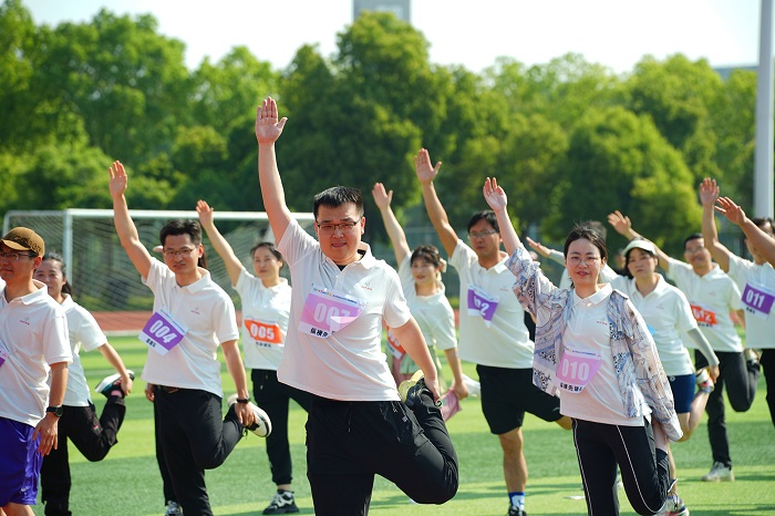 ▲專業(yè)教練帶領全員進行活力十足的熱身操