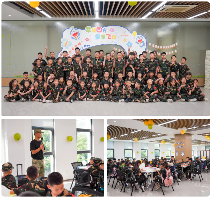 夏令營現場布置精心,彩色氣球、卡通形象與勵志標語營造出專業而溫馨的托育氛圍。本次夏令營邀請了專業的素質拓展培訓機構,開營儀式上,教官團隊熱情迎接每一位小營員,并強調了組織紀律性,寄語孩子們在快樂中收獲成長。
