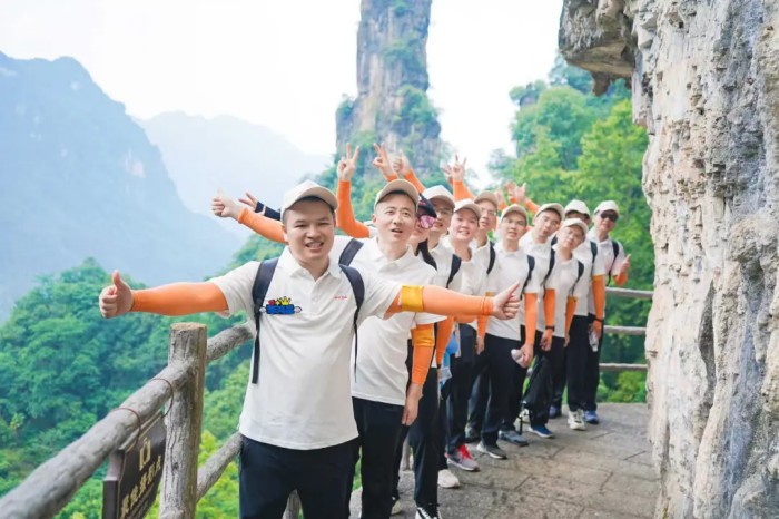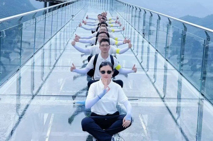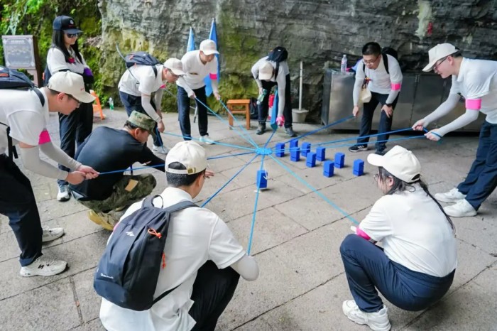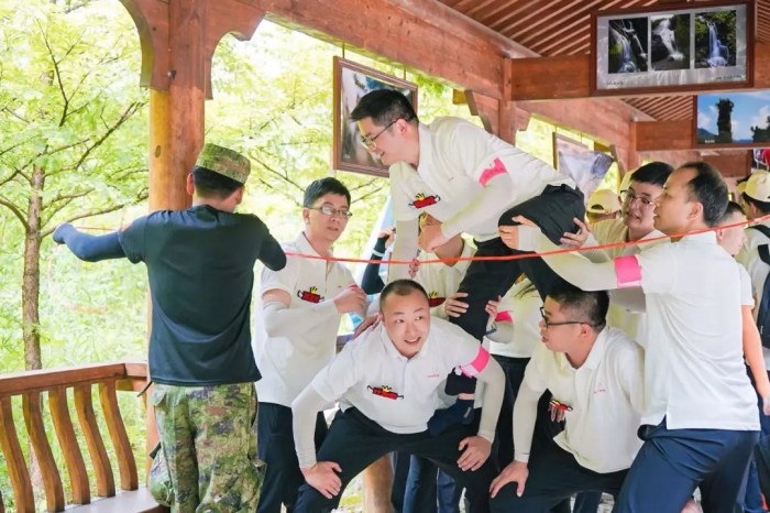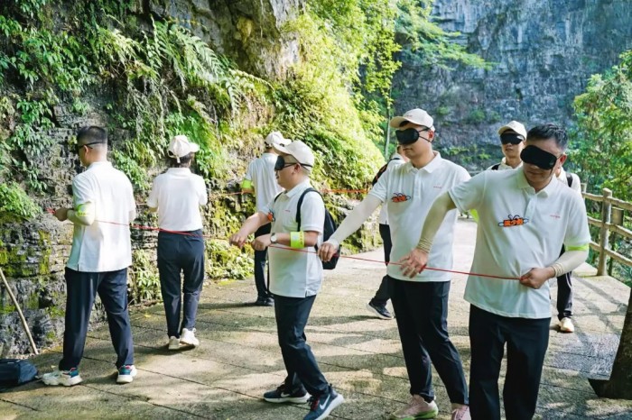 出征儀式結束后,隊員們迎來本次淬煉之旅的第一個挑戰——清江方山8.5公里徒步。參訓人員互幫互助,克服山路、高溫、降雨等自然挑戰,直面懸崖玻璃棧道恐懼。行進中各支隊伍穿插完成多項團隊協作項目,在"雷區取水"中展現智慧與默契,在"穿越封鎖線"中培養信任與配合,通過"盲人方陣"磨練溝通技巧,借助"步步高升"提升協作能力。各支隊伍還圓滿完成了微電影拍攝任務,大家群策群力、各展所長,用鏡頭記錄下這段難忘的淬煉時光。