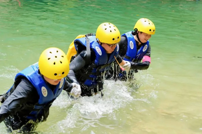 7月12日清晨,6支隊伍再度集結,進行更具挑戰性的戶外項目。在險峻的峽谷之間,參訓隊員完成了近4公里溯溪,以及驚心動魄的10米、40米瀑降,最后是終極挑戰5米跳潭,所有隊員無一人退縮,戰勝恐懼勇敢一躍。在這一天的極限挑戰中,參訓隊員始終把集體榮譽擺在首位,在挑戰中主動擔當、互相鼓勵,不僅圓滿完成任務,更展現出了運營團隊出色的凝聚力、戰斗力和執行力。