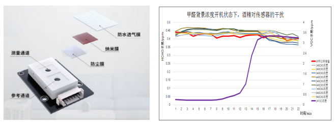 1、創造性的使用雙甲醛傳感器膜的檢測技術,抗酒精等交叉氣體干擾,酒精干擾<1%,可同時輸出HCHO,TVOC,VOC,溫度,濕度參數。