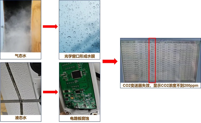 為保持適宜的濕度,菇農(nóng)們使用手持噴霧器或微噴系統(tǒng),向菇房內(nèi)均勻噴灑細(xì)小的水霧,伴隨著菌群呼吸產(chǎn)生的水汽,菌菇房儼然成為了天然的“蒸汽房”。此時,水分子則通過兩種形態(tài)向CO?變送器發(fā)起攻擊!