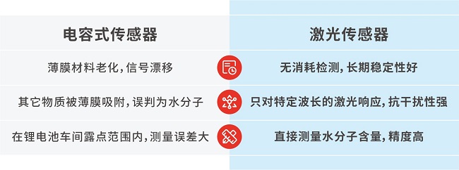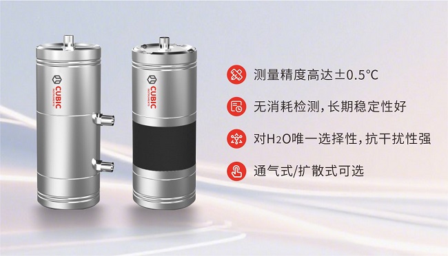 目前,鋰電池車間常用電容式薄膜聚合物傳感器監測露點。其原理是水分子吸附于薄膜聚合物,介電常數發生變化,從而推算露點溫度。