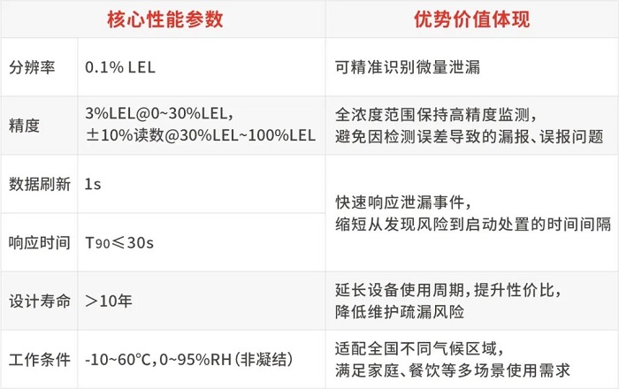 該傳感器核心技術基于非分光紅外(NDIR)原理,通過檢測丙烷分子對特定紅外光的吸收,實現物理級精確測量,可實時計算丙烷氣體濃度,數據刷新速度快至 1 秒,確保泄漏情況及時發現。