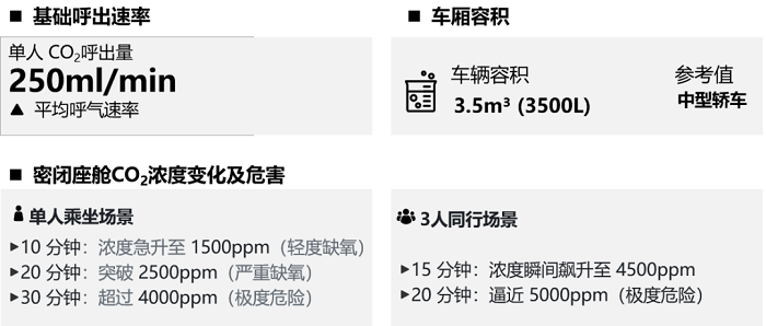 汽車座艙空間有限,人體呼吸會持續消耗O2、呼出CO2。在車窗緊閉、內循環開啟的密閉座艙環境,新鮮空氣無法及時補充,導致CO2濃度短時間內快速攀升,超過安全閾值,不僅影響司乘人員的健康,嚴重還會引發疲勞駕駛引發交通事故。更多內容詳見《車內缺氧隱患:被忽視的二氧化碳濃度監測》
