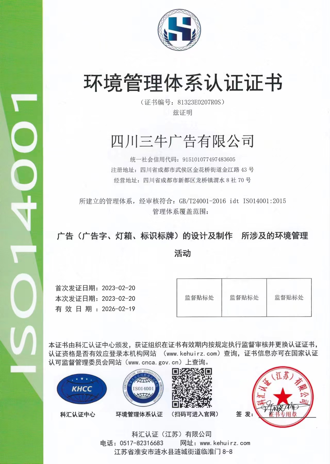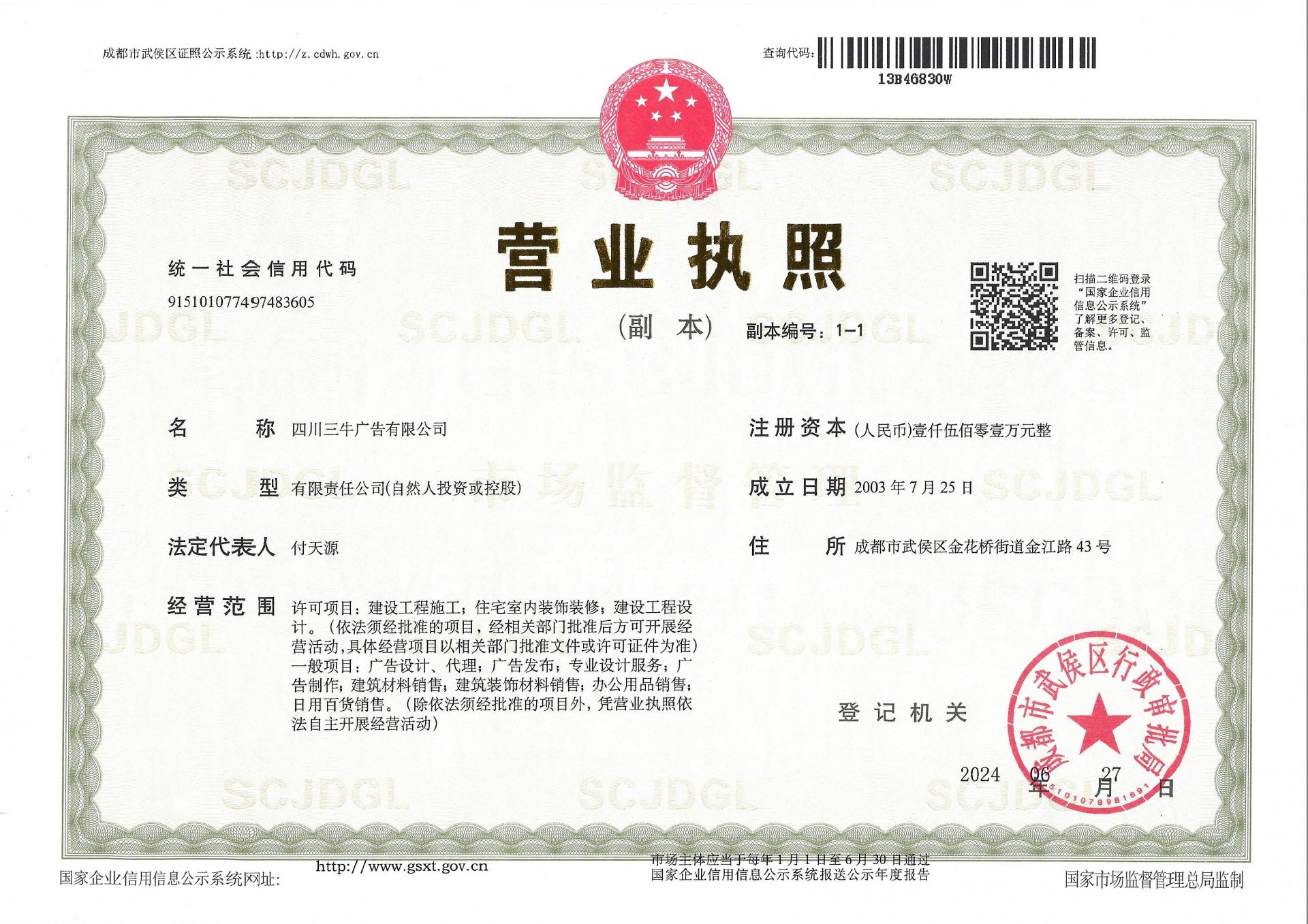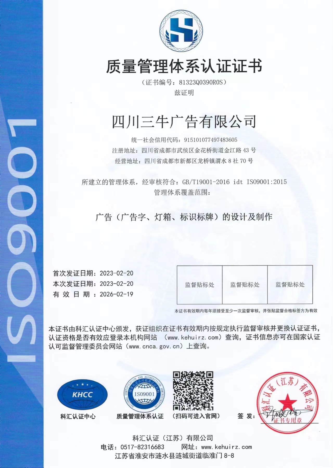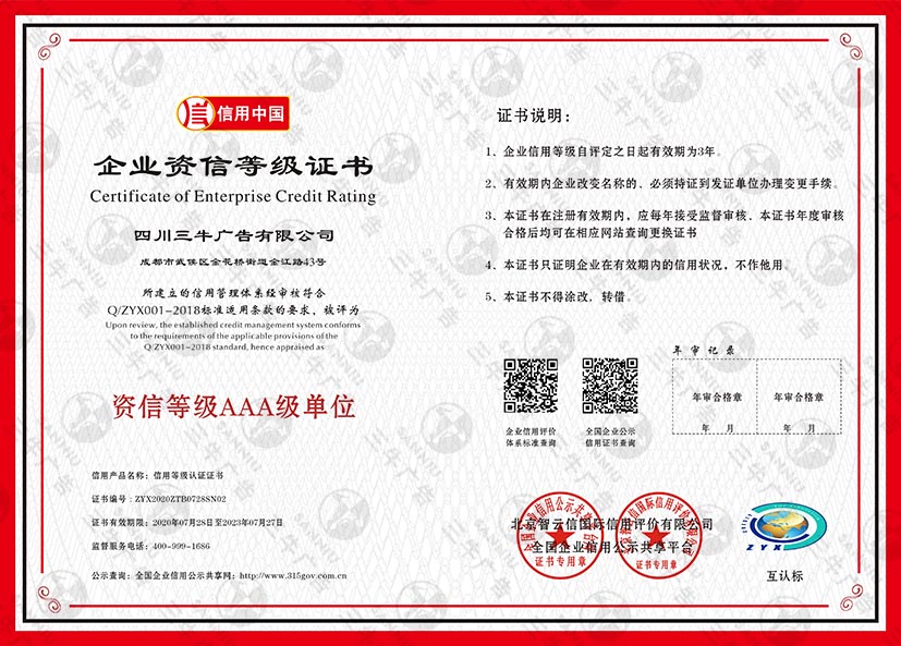 公司一直本著“三牛為仁人,仁人為三?!钡慕?jīng)營理念,不斷提高產(chǎn)品質(zhì)量、推陳出新、精益求精,和上千家廣告公司和直接客戶建立了良好的業(yè)務(wù)合作關(guān)系。精良的生產(chǎn)工藝,訓(xùn)練有素的專業(yè)人員,確保向每一項(xiàng)工程提供優(yōu)質(zhì)的產(chǎn)品,高效率的施工和良好的后期服務(wù)。公司通過競標(biāo)等途徑成為了各大銀行、四川農(nóng)信、中國郵政、國家電網(wǎng)等大型集團(tuán)公司;藍(lán)光、保利、中糧等房產(chǎn)公司的合格供應(yīng)商。
